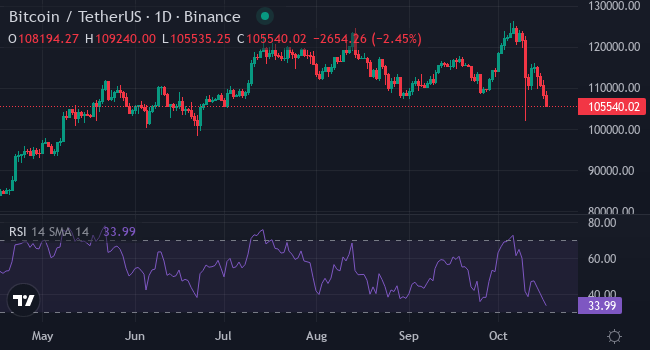 Semnalele tehnice indică epuizare. RSI se află la 26,17 și stocasticul la 2,18 — ambele în zona de supravânzare. Prețul se menține în apropierea mediei pe 10 zile, la 107958, puțin sub linia de 100 de zile, la 111.922.